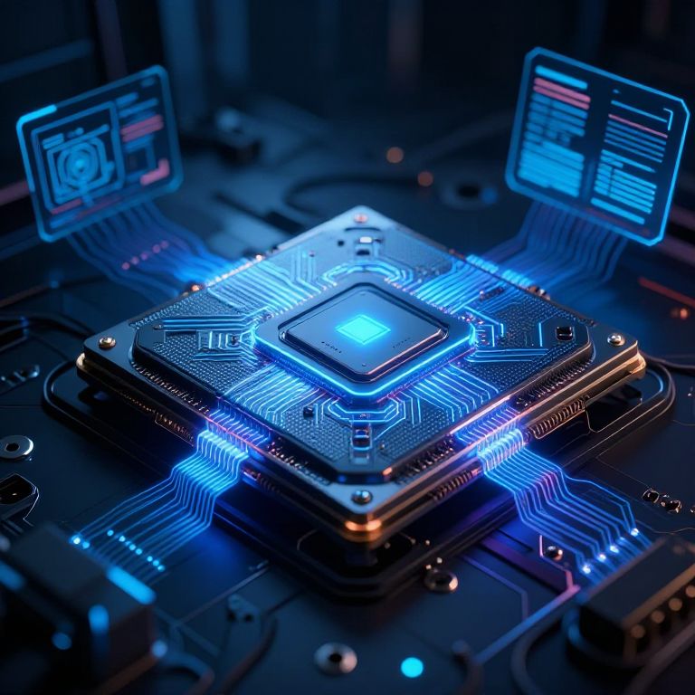 Photorealistic CGI of a glowing blue CPU chip on a dark circuit board, surrounded by illuminated digital screens with code.