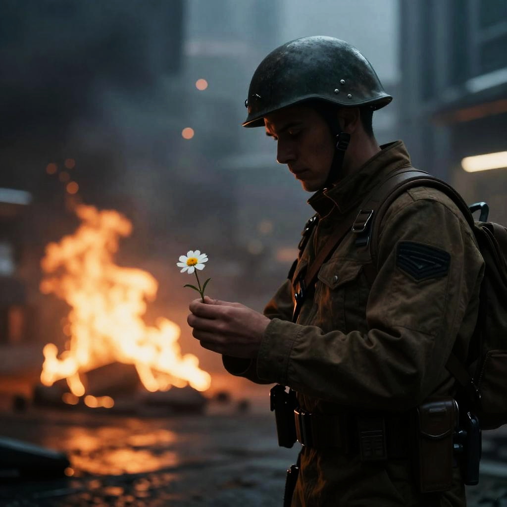 Cinematic Dystopian Riot Soldier With Flower
