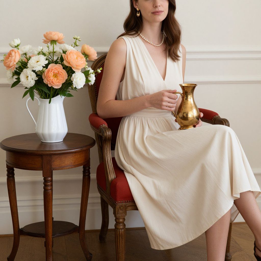 Seated gracefully in a vintage red chair, a woman in a cream-colored dress holds a small golden vase while a vibrant bouquet of peach and white flowers rests in a white pitcher atop a wooden side table beside her.