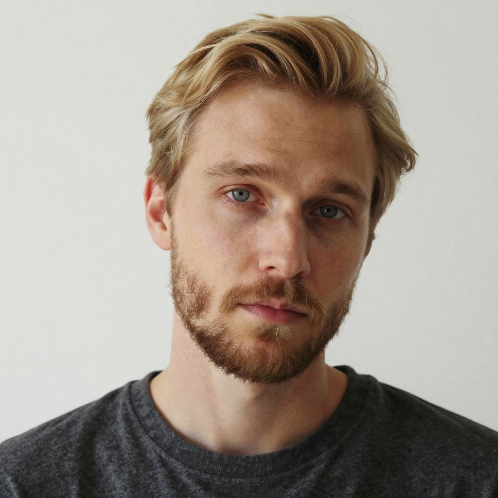 Blonde person with a beard, portrait in soft natural light, detailed skin texture, modern casual clothing, realistic style