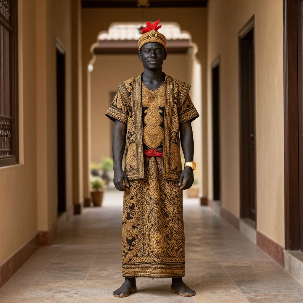 Melanau Costume, man in a traditional dress standing in a hallway