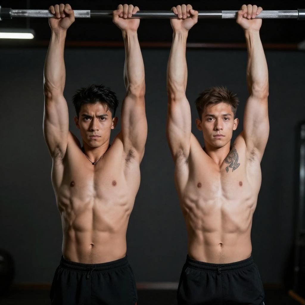 Muscular man with tattoos on his right arm, wearing a green tank top and black fingerless gloves, bent over a barbell in a dimly lit gym. Intense facial expression. Gym equipment and mirrors in the background.