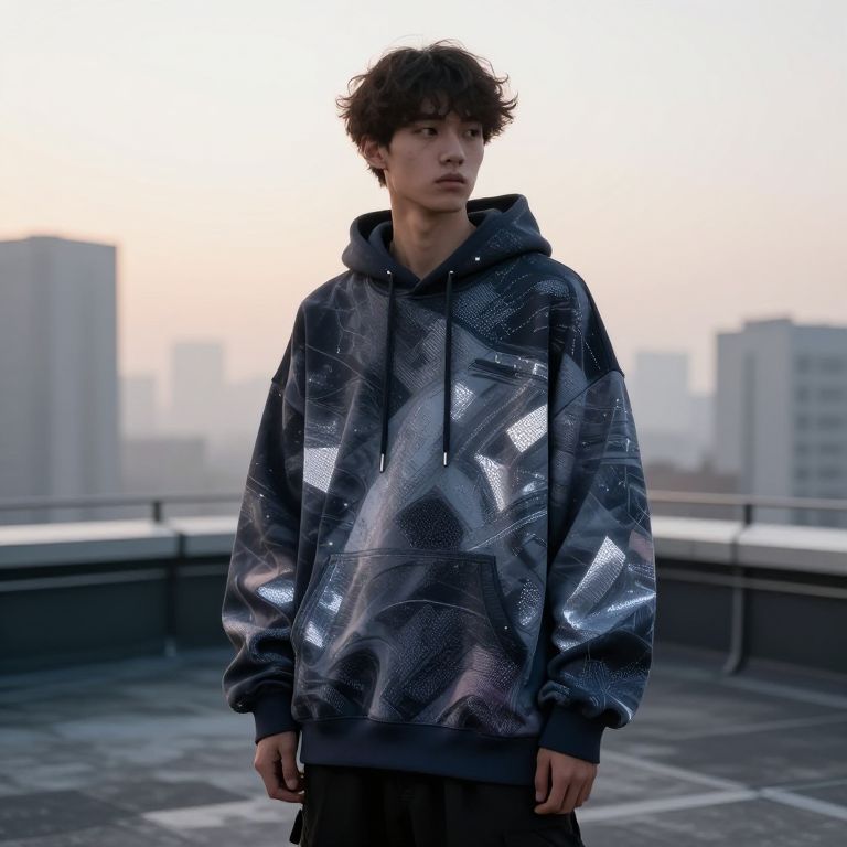 Streetwear oversized hoodies with abstract digital art patterns and reflective mesh texture, worn by a young urban figure standing on a city rooftop at sunrise, soft morning fog, modern street aesthetic, high-resolution, hyper-detailed, MidJourney style.