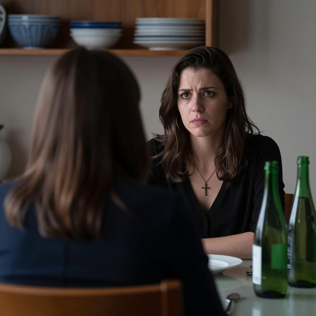 Two women in a kitchen. Left woman with short dark hair, dark blue sweater, side profile, serious expression. Right woman with brown hair, white shirt, blue checkered apron, holding white bowl, looking down, slight smile. Background: light green wall, wooden decoration, black and white counter, kettle. Light shadows. Realistic photograph.