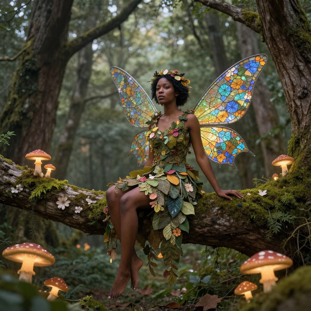 A black woman fairy perched on a moss-covered branch, her delicate wings sparkling like stained glass, dressed in a nature-inspired gown of leaves and petals, framed by ancient trees and glowing mushrooms, serene expression, fantasy illustration, rich colors, mystical ambiance