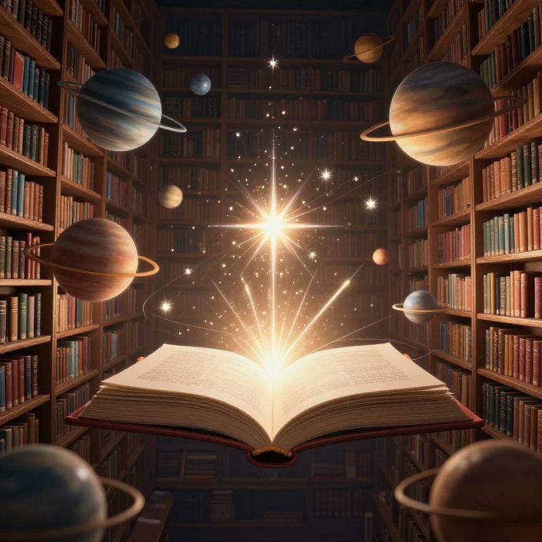 Planets float inside a vast library book, revolving around a glowing star-shaped sentence crafted by sentient ink.