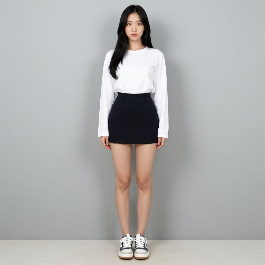 Photograph of an Asian woman with long black hair standing against a plain gray background. She wears a white long-sleeve shirt, high-waisted black mini-skirt, and white low-top sneakers with black laces. Her expression is neutral, and she stands with her arms relaxed by her sides. The lighting is even, highlighting her fair skin and the simplicity of her outfit. The image focuses on her full-body, capturing her from head to toe in a straightforward, minimalistic style.