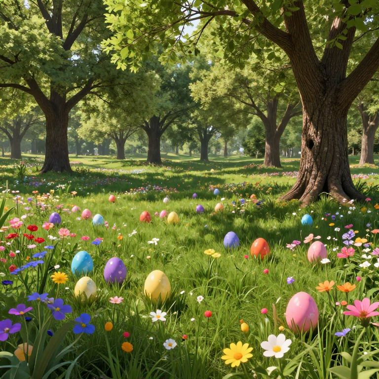 A vibrant meadow filled with multicolored Easter eggs scattered among lush green grass and a variety of colorful wildflowers under large, mature trees. The scene conveys a bright, imaginative Easter theme with detailed natural elements and soft daylight filtering through the tree canopy.