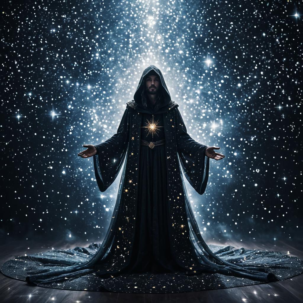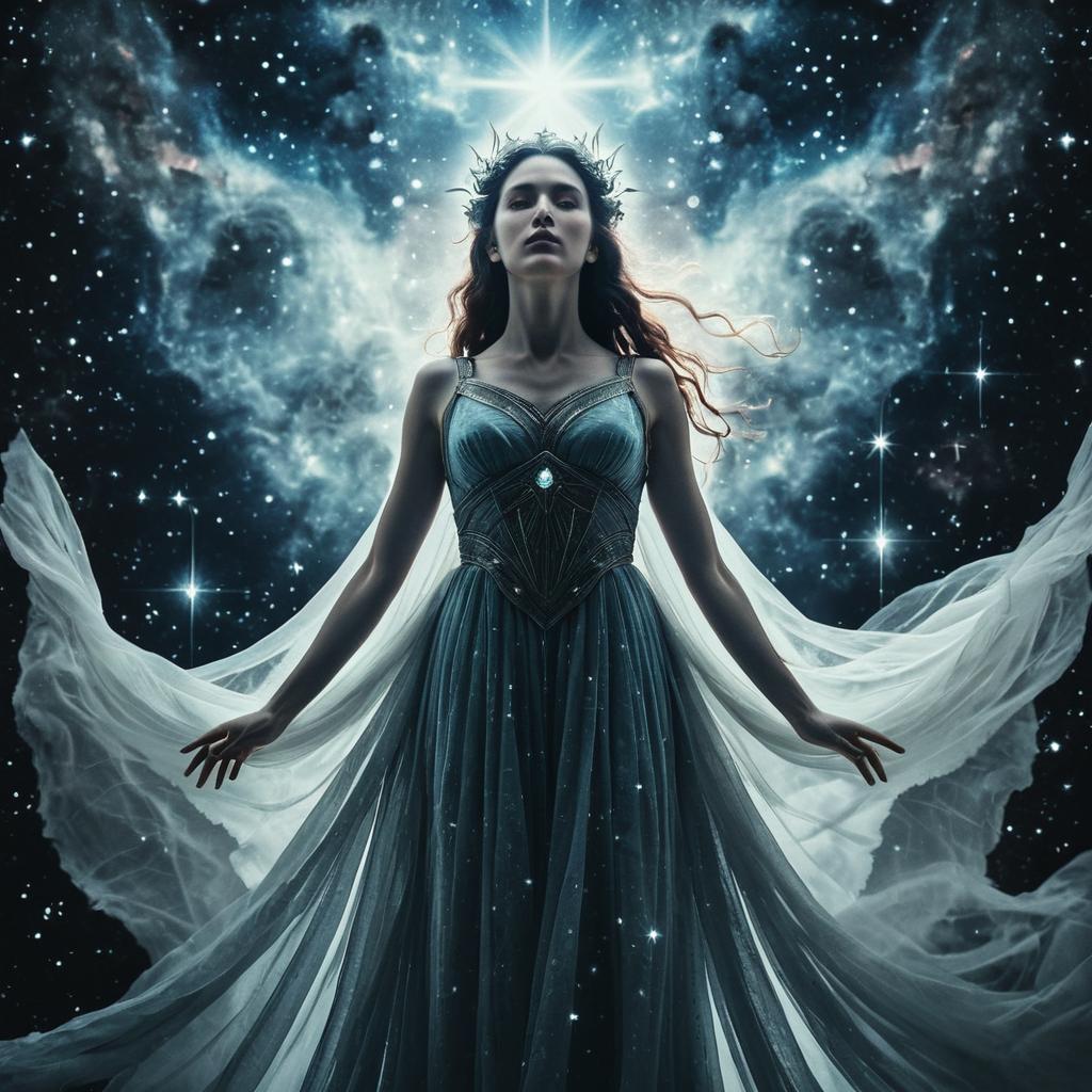 Artistic portrayal of an astral maiden standing with outstretched arms, enveloped in a flowing translucent and opaque gown. The figure is backlit by a bright nebula, surrounded by stars and cosmic clouds, creating a surreal and divine atmosphere. The maiden wears an intricate crown, symbolizing celestial royalty, with a moody and ethereal aesthetic.