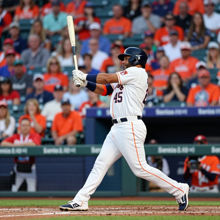 Yordan Alvarez #45 of the Houston Astros, wearing a white uniform with orange trim and navy accents, swings his bat during the SiriusXM All-Star Futures Game at Nationals Park in Washington, DC, as a crowd of spectators watches intently from the stands behind him.