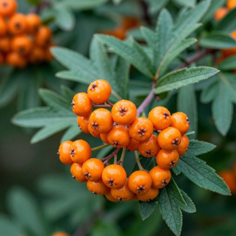 Clustered Pyracantha berries gleam vibrantly orange against a backdrop of lush green foliage, their glossy surfaces accentuated by delicate stems and serrated leaves.