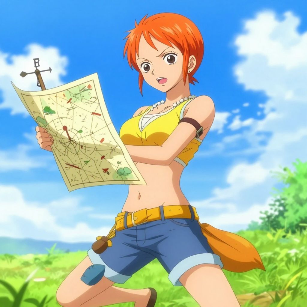 How old is nami pre timeskip, anime style pirate navigator with short bright orange hair, holding a weather vane map, wearing casual summer clothes, vivid colors, dynamic pose