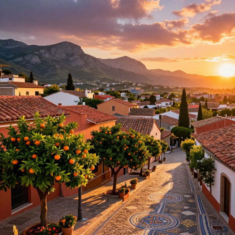 Photograph of a sunlit Spanish village with orange trees, red-tiled roofs, cobblestone street, mountain backdrop, and vibrant sunset sky.