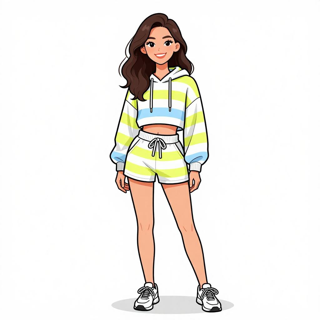 Digital illustration of a smiling young woman with long brown hair, wearing a yellow and white striped hoodie, white shorts, and white sneakers, standing against a