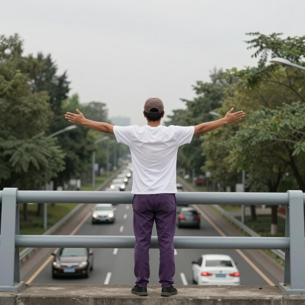 Man standing with arms outstretched on a highway overpass, facing away. He wears a white t-shirt, purple pants, black shoes, and a brown cap. Multiple vehicles travel on the road below. Green trees line both sides of the highway. Overcast sky. Metal overpass structure in foreground.