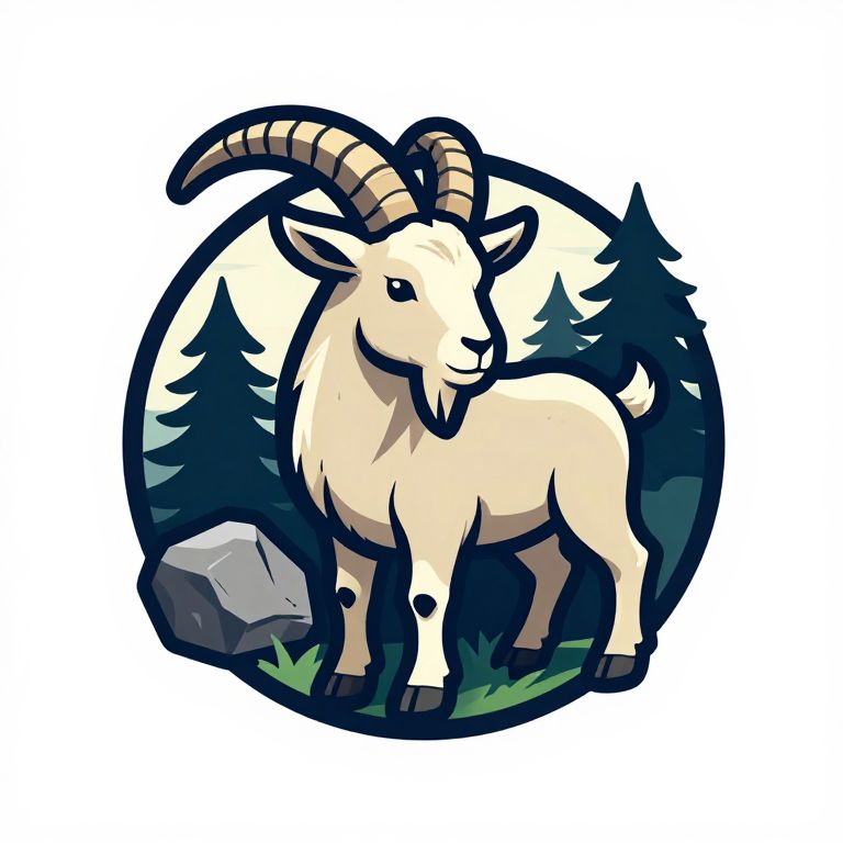 Billy goat logo combining a strong billy goat figure with nature elements like rocks and pine trees, illustrated in vibrant colors with a clean, contemporary emblem style.