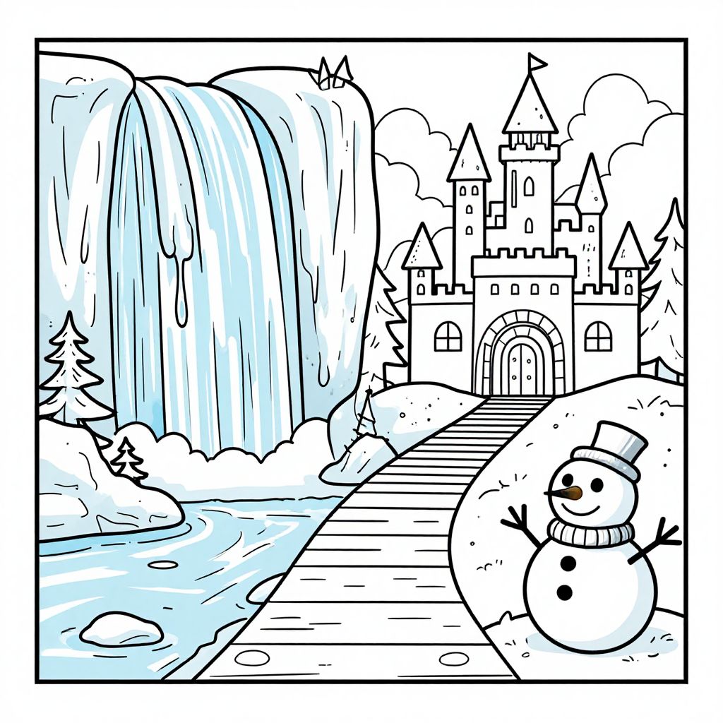 A black and white coloring sheet features a frozen waterfall, a hidden winter fairy castle, a secret pathway, a snowman, and winter elements, all depicted in a cartoon style with strong outlines and contours.