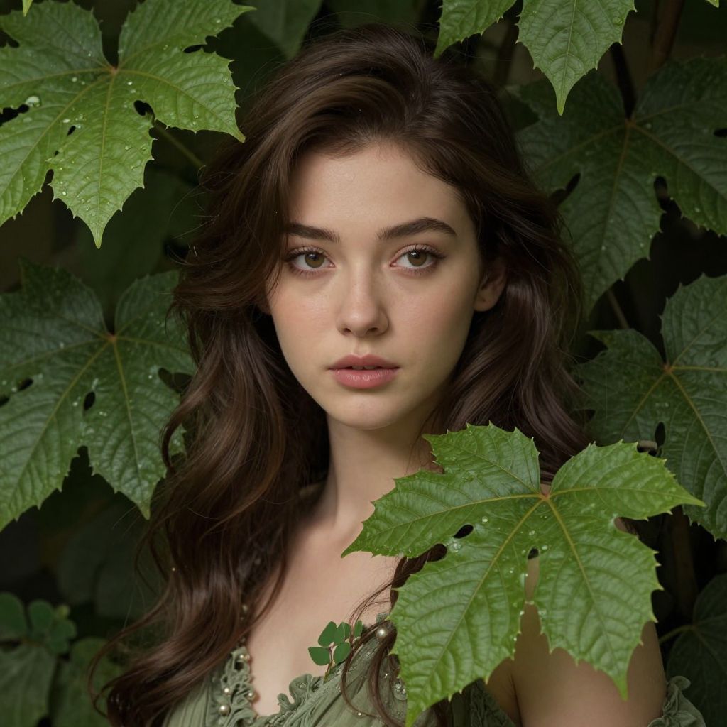 A highly detailed digital matte painting of a young woman surrounded and engulfed in green leaves, artstation, detailed woman, stunning volumetric lighting, elegant, fantasy, 4k