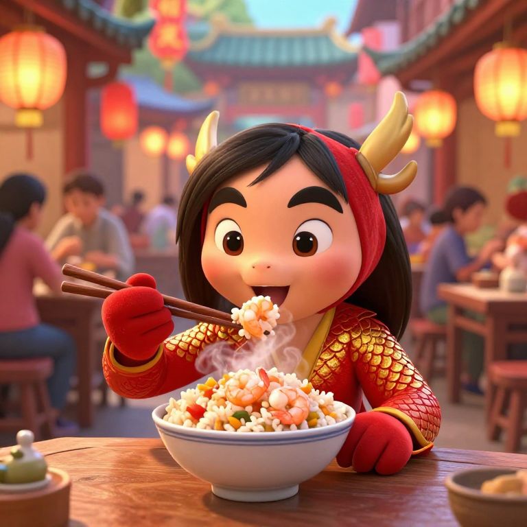 A realistic depiction of Mushu from Mulan, sitting at a wooden table in a lively and colorful Chinese street market, eating a bowl of shrimp fried rice with a pair of chopsticks held expertly in his clawed hands, His red and gold scales glisten in the soft glow of nearby lanterns, and his expression is comically focused as he lifts a perfectly balanced bite of rice and shrimp to his mouth, Steam rises from the bowl, adding a warm, inviting feel to the scene, The background is bustling with market stalls and vibrant decorations, with other patrons and vendors enjoying the lively atmosphere, Mushu's playful energy shines through in the fun and lighthearted setting