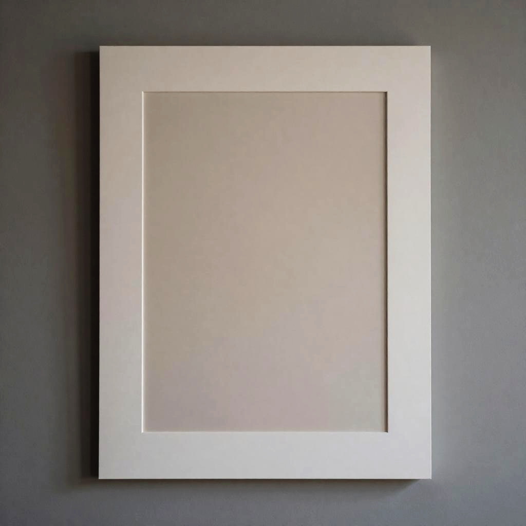 A minimalist photograph featuring a blank white rectangular picture frame mounted on a neutral gray wall. The image showcases soft brightness and cinematic lighting that accentuate the clean lines and subtle shadows of the frame, evoking a calm and modern aesthetic.
