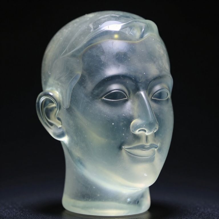 A highly detailed, translucent glass sculpture of a man's head with a small smile, illuminated by photorealistic film-like lighting against a dark background.