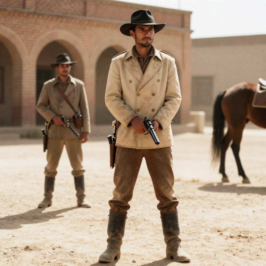 Photograph of a man in military attire riding a black horse, holding a rifle, with intense expression. Behind him, a burning tank with another person partially visible, engulfed in smoke. Dry, barren landscape with leafless bushes. Dust kicked up under the horse.