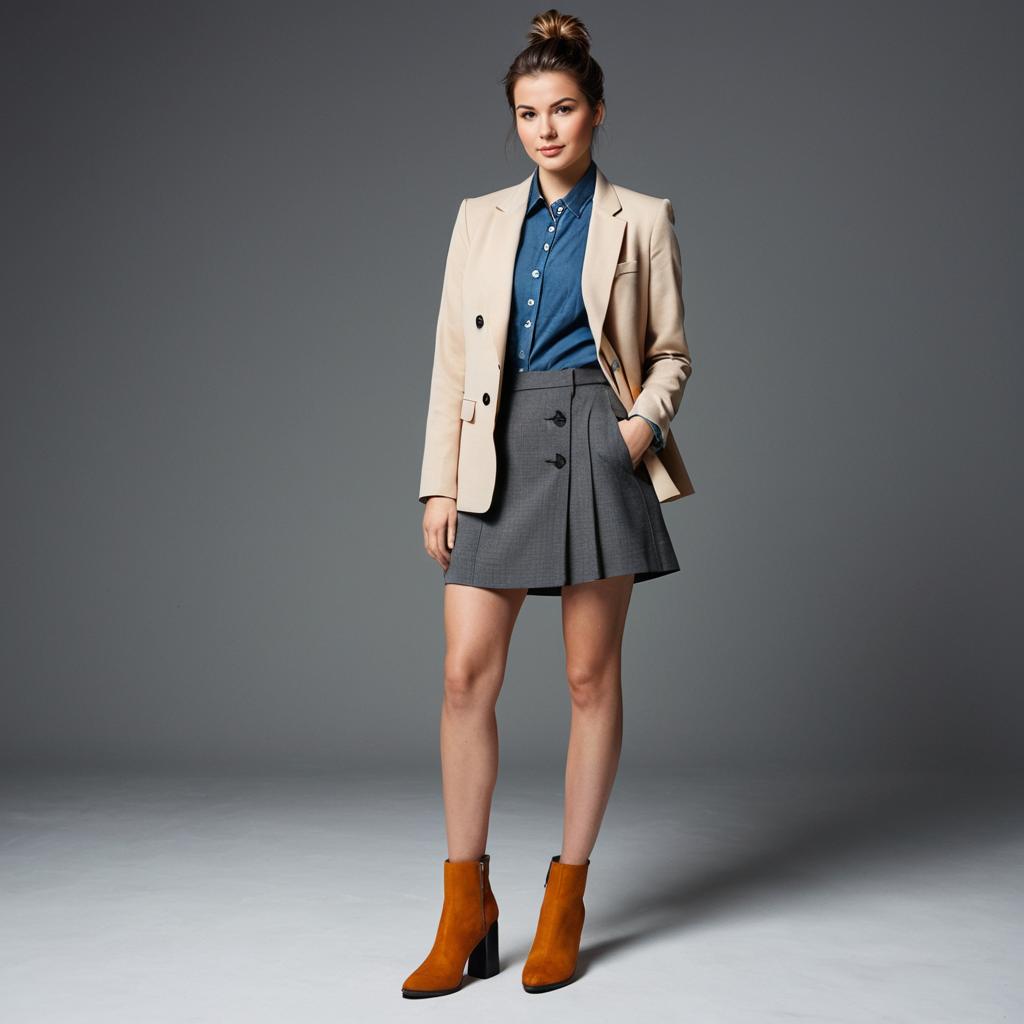 Professional outfit booties, photorealistic, young woman, standing, neutral grey background, studio lighting, full body, casual yet stylish, beige double-breasted blazer, blue button-up shirt, short dark grey skirt, orange ankle boots with block heels, brown hair in a loose bun, relaxed pose, hands in jacket pockets, confident expression, minimal accessories, modern fashion, subtle shadows, professional studio photograph, fashion model, contemporary style, clean lines