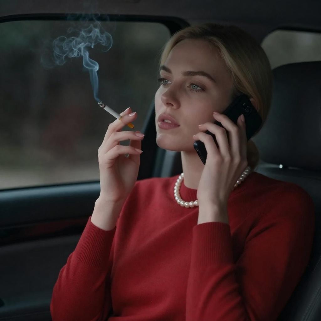 Woman with long blonde hair, wearing a loose blue shirt, sitting on a bed with a white metal headboard, holding a gun, looking to the side. Bed has crumpled brown quilt and stacks of money. Wooden nightstand with bottles and lamp. Warm, dim lighting.