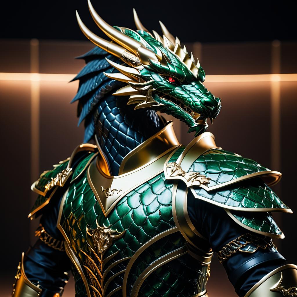 A fierce dragon model wearing Gucci armor, luxury materials, cinematic and professional studio lighting, sharp focus, 4K.