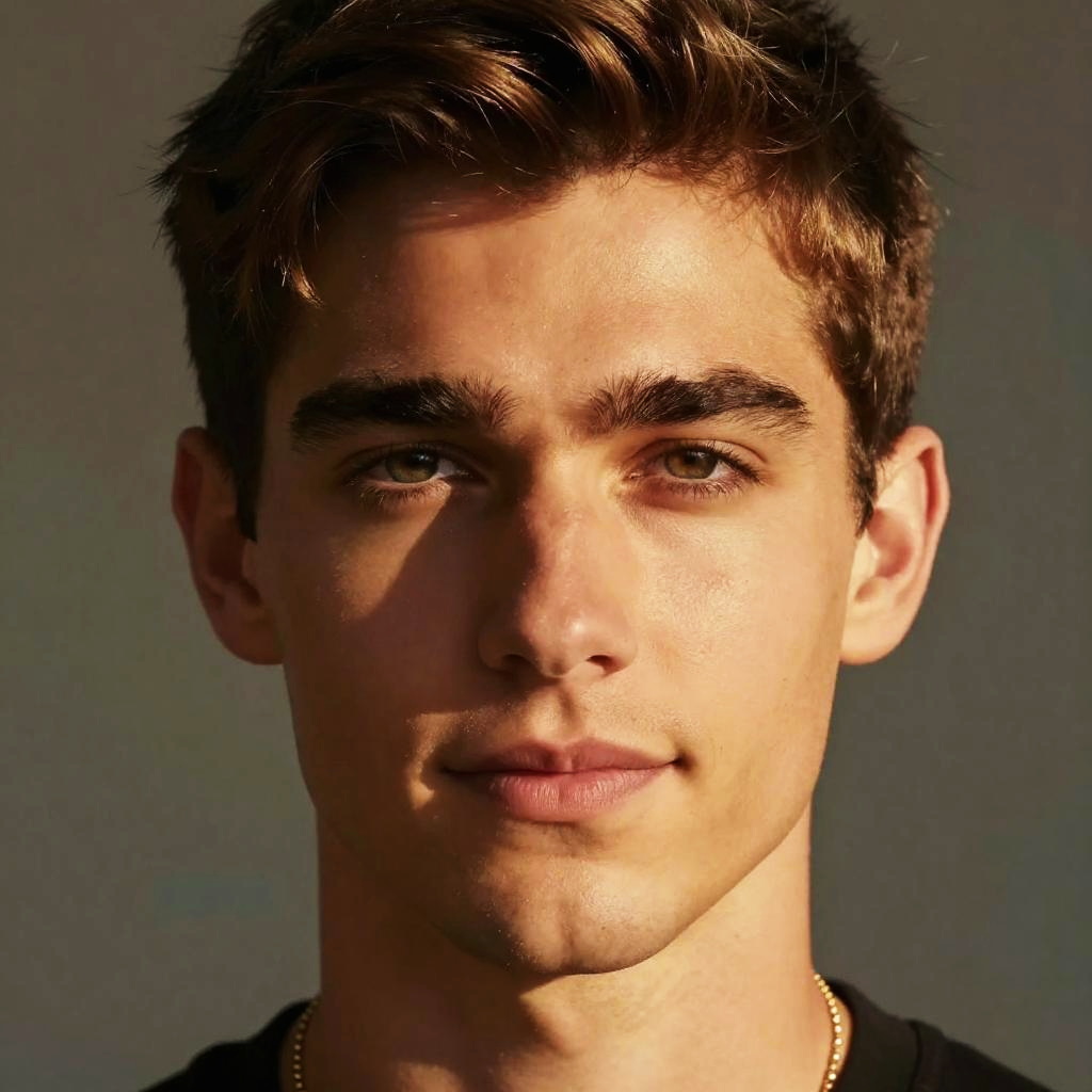Photograph of a young man with short brown hair, light skin, green eyes, subtle smile, wearing a black shirt and gold necklace, illuminated by