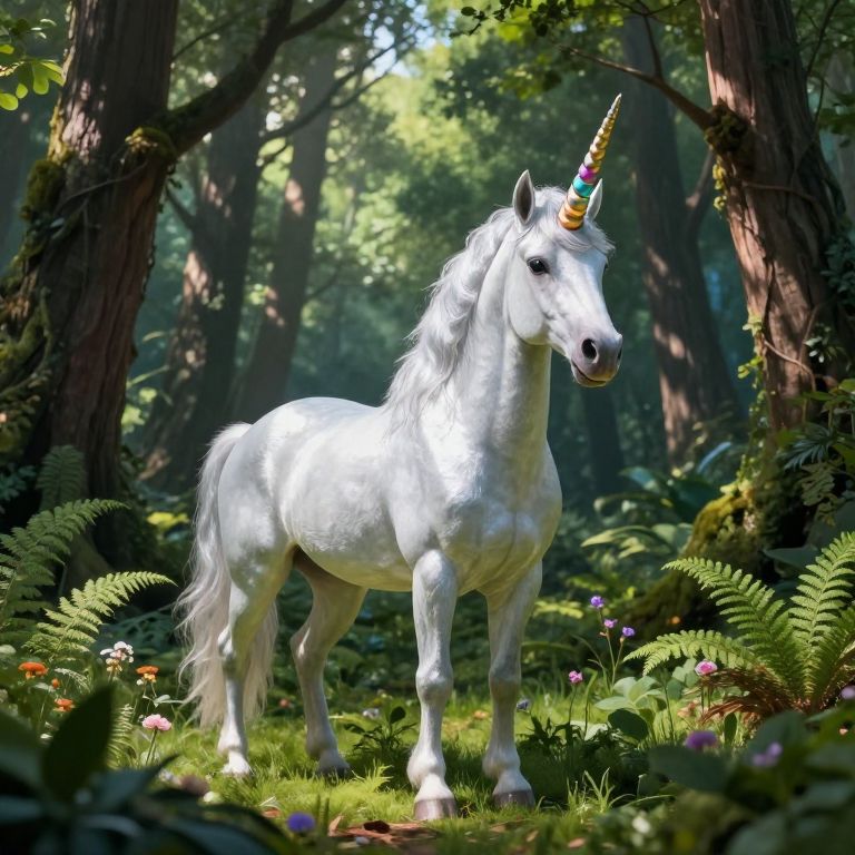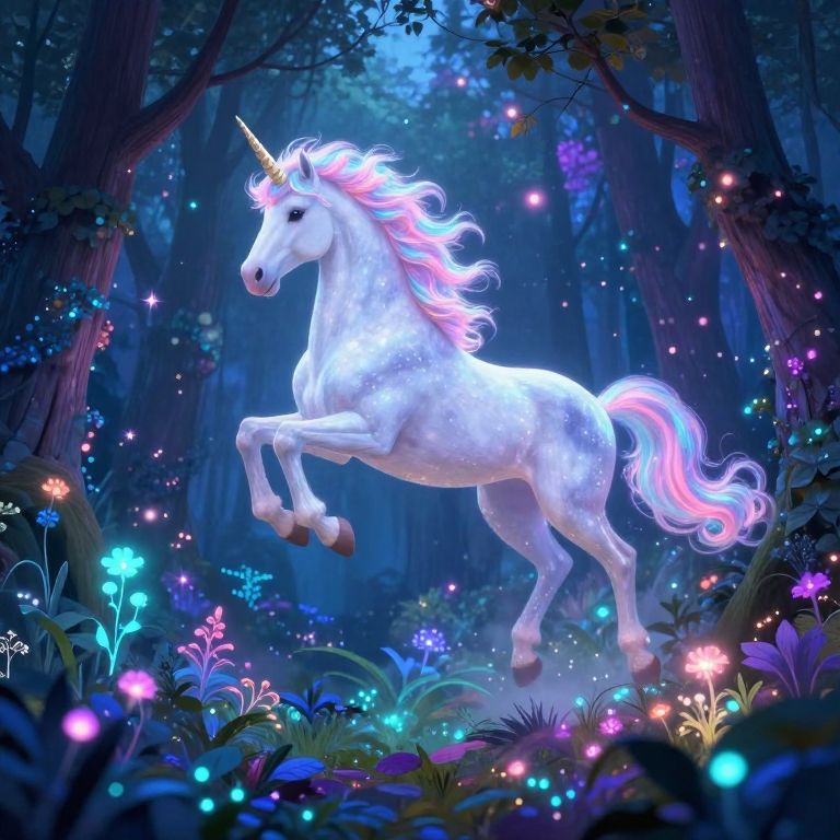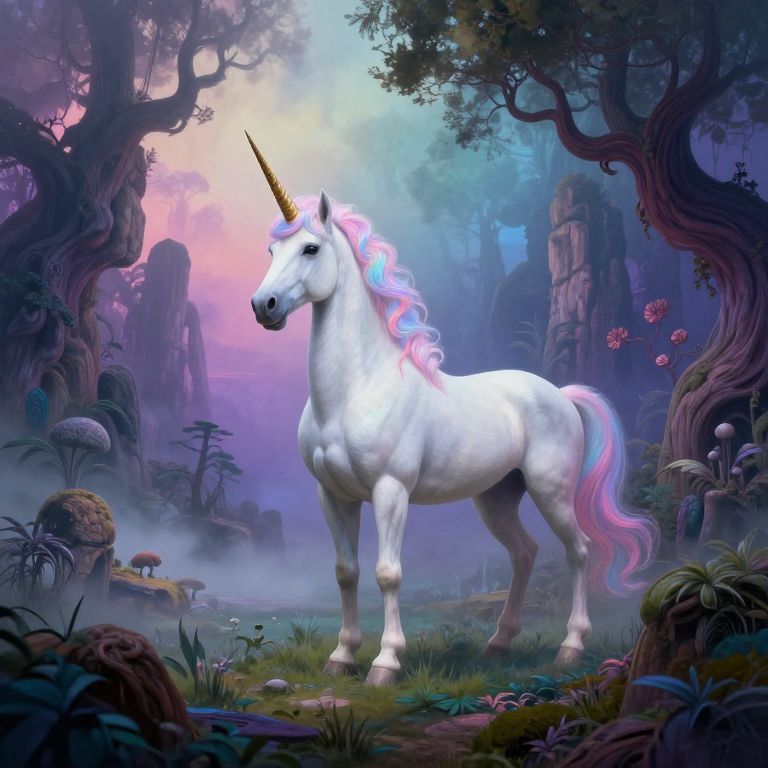 Digital fantasy artwork depicting a majestic white unicorn with a pastel pink and blue mane and tail, standing in a mystical forest. The unicorn has a golden horn and a muscular build. The background features towering, twisted trees, colorful mushrooms, and misty, ethereal light. The forest floor is lush with grass and small plants. The scene is bathed in a dreamy, multicolored light, blending purples, pinks, and blues, creating a magical, otherworldly atmosphere. The unicorn is centered, facing slightly to the left, with a serene expression.