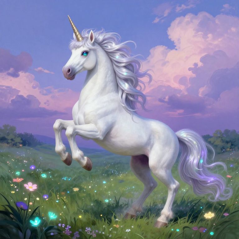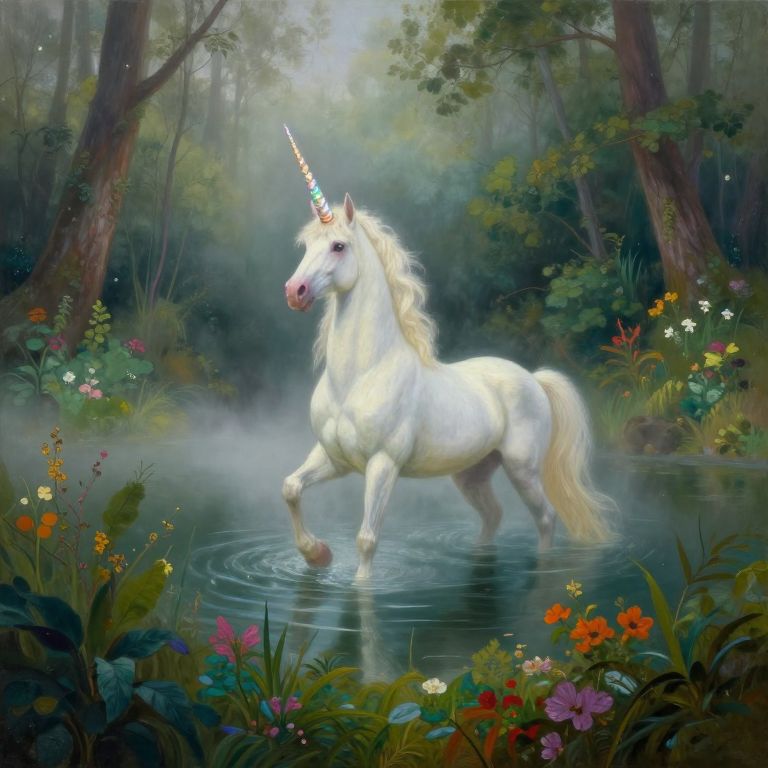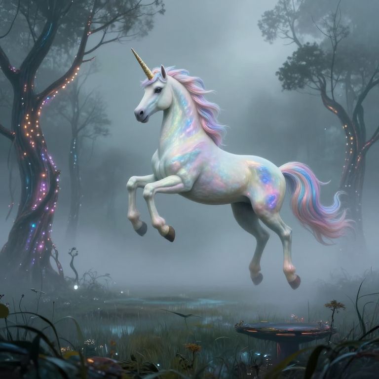 In the surrealistic style blending dreamlike landscapes with vivid color transitions reminiscent of an enigmatic painter, depict a majestic unicorn standing in an ancient glen enveloped by a mystical mist. The scene should be rendered with captivating gradients transitioning from iridescent to deep hues, accentuating the magical allure of this mythical creature. From a unique 'worm's-eye view', capture intricate details of the landscape as if seen through a dream, featuring towering rock formations and gnarled trees entwined with the ethereal presence of the unicorn, creating an enchanting atmosphere that transports the viewer to a realm where fantasy and reality seamlessly merge.