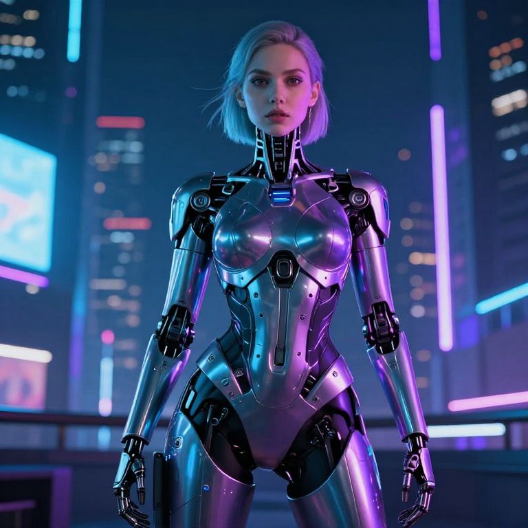 Futuristic kobieta with cybernetic enhancements standing in a neon-lit cityscape at night, sleek metallic textures, glowing blue and purple lights reflecting off her skin, cyberpunk theme, intense gaze and confident pose, detailed urban environment