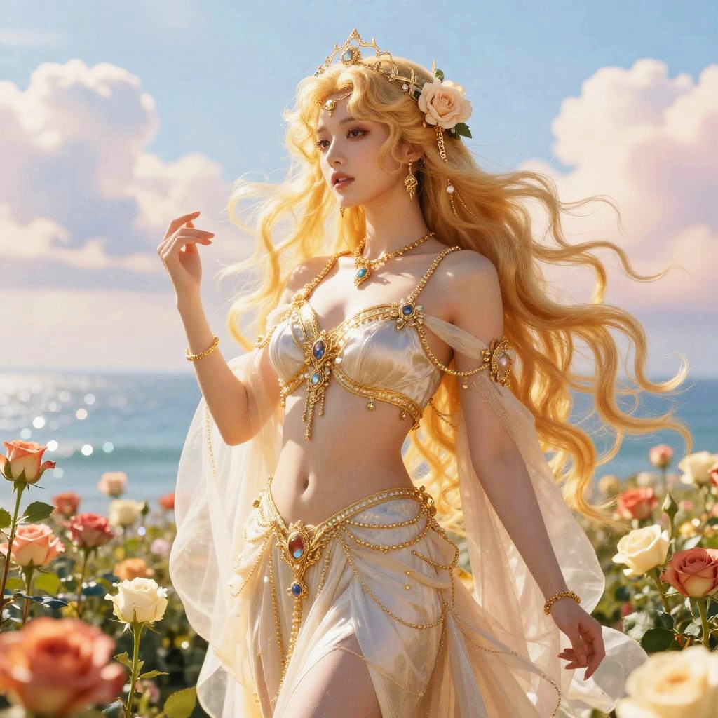 Aphrodite goddess anime style, depicted as a radiant and ethereal figure with flowing golden hair, adorned with intricate floral accessories, standing amidst a shimmering sea of roses and soft pastel clouds, vibrant colors, high fantasy background.