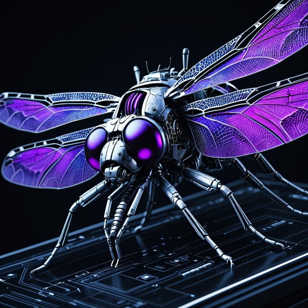 Mechanical dragonfly with purple neon, featuring a hyper-detailed face. Styled in fantasy art, with a professional, cinematic quality in sharp focus. Hyperrealistic with attention to detail and natural realism, featuring complex circuitry patterns. High-definition, 3D rendering, CGI, with lots of detail for a polished, high-quality finish.