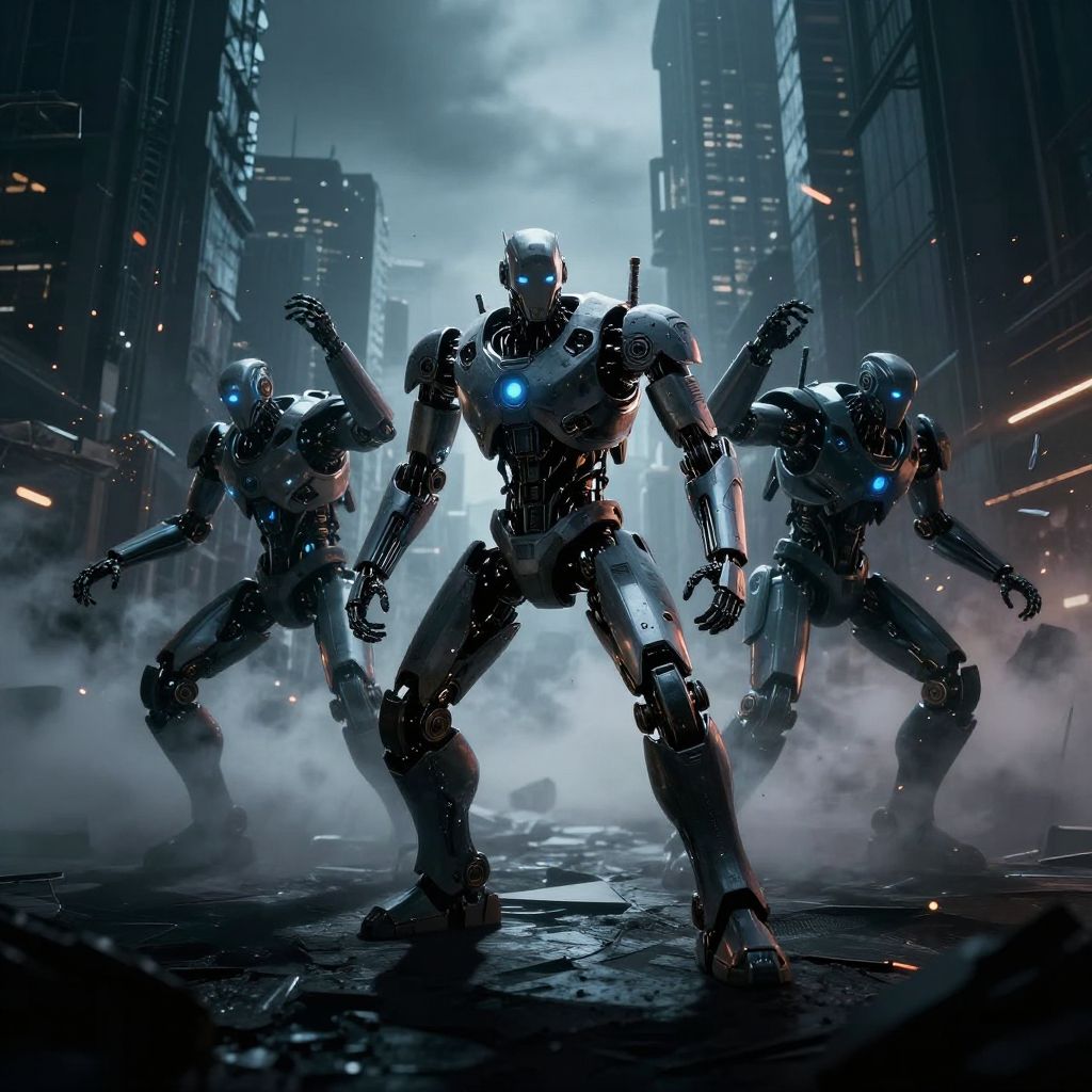 Flashman depicted in an epic battle scene against robotic enemies on a dystopian battlefield, charging up with brilliant electric energy, shattered ground and sparks flying everywhere, dynamic perspective with motion blur, dark clouds overhead with flashes of lightning, highly detailed sci-fi art.