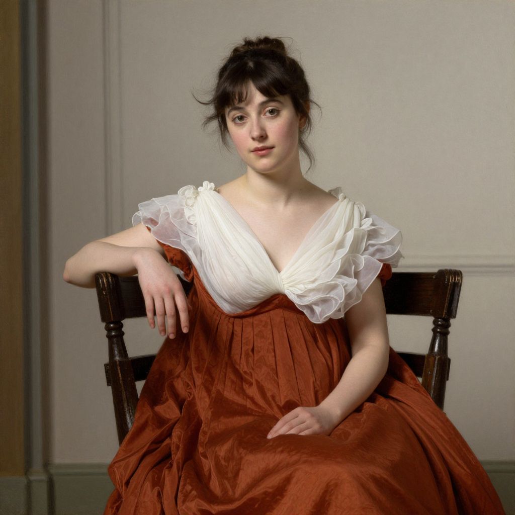 Woman seated gracefully in a rust-colored gown with white ruffled shoulders, her hand resting elegantly on a dark wooden chair, captured in a serene indoor setting by John William Waterhouse in 1849-1917 titled *The Lady of Shalott*.