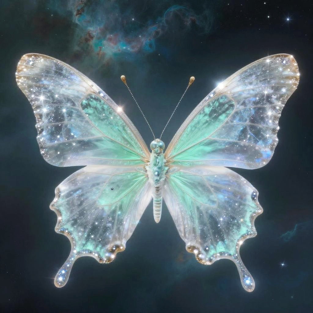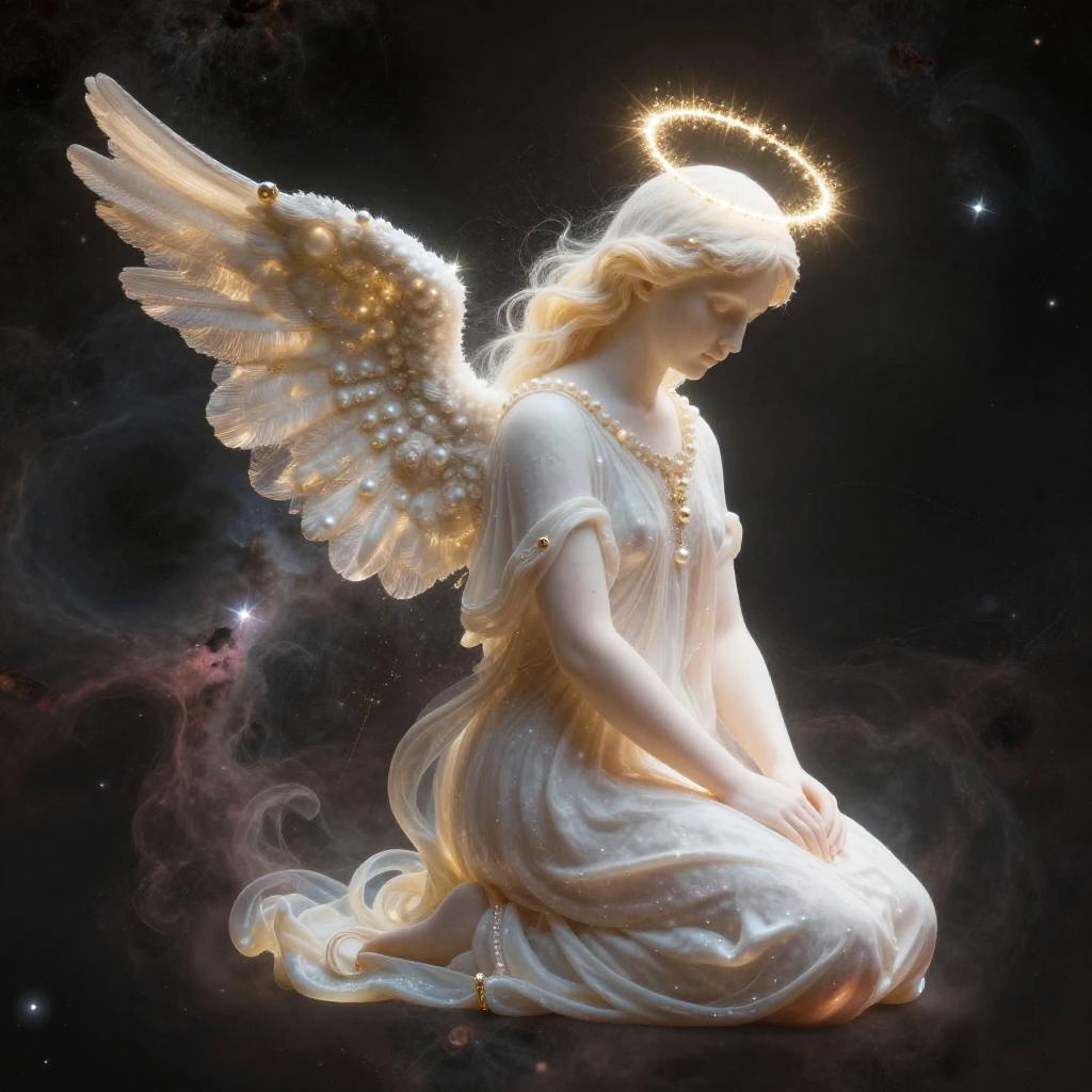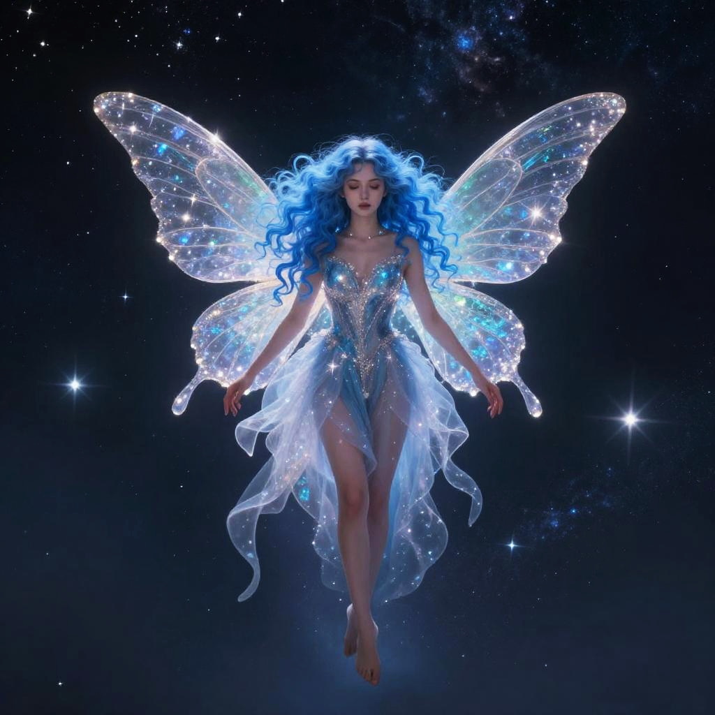 A delicate planetary nebula in deep space, shaped like a fairy seated. The form features twinkling stardust wings with shimmering stardust trailing from the dress. Rendered in soft hues of pastel pink, iridescent lilac, moonstone white, with faint nebula lights creating a glowing silhouette that appears as if in motion. The composition is ultra-detailed, with a mystical and dreamlike quality, capturing an otherworldly sense of elegance.