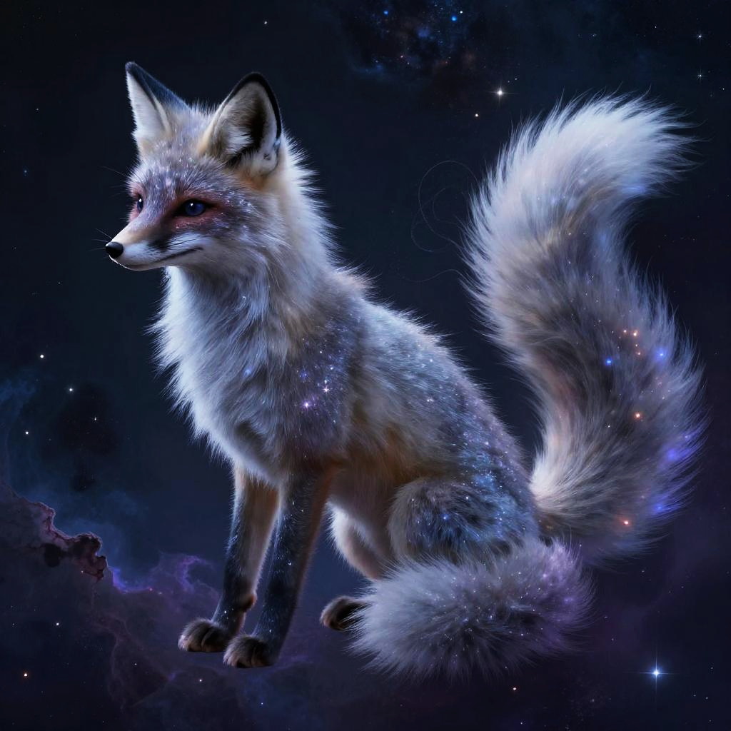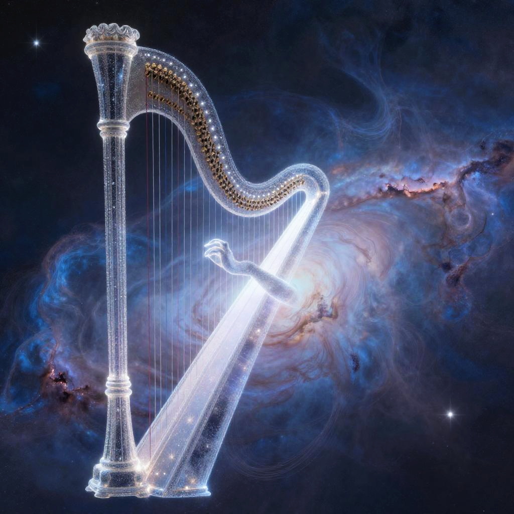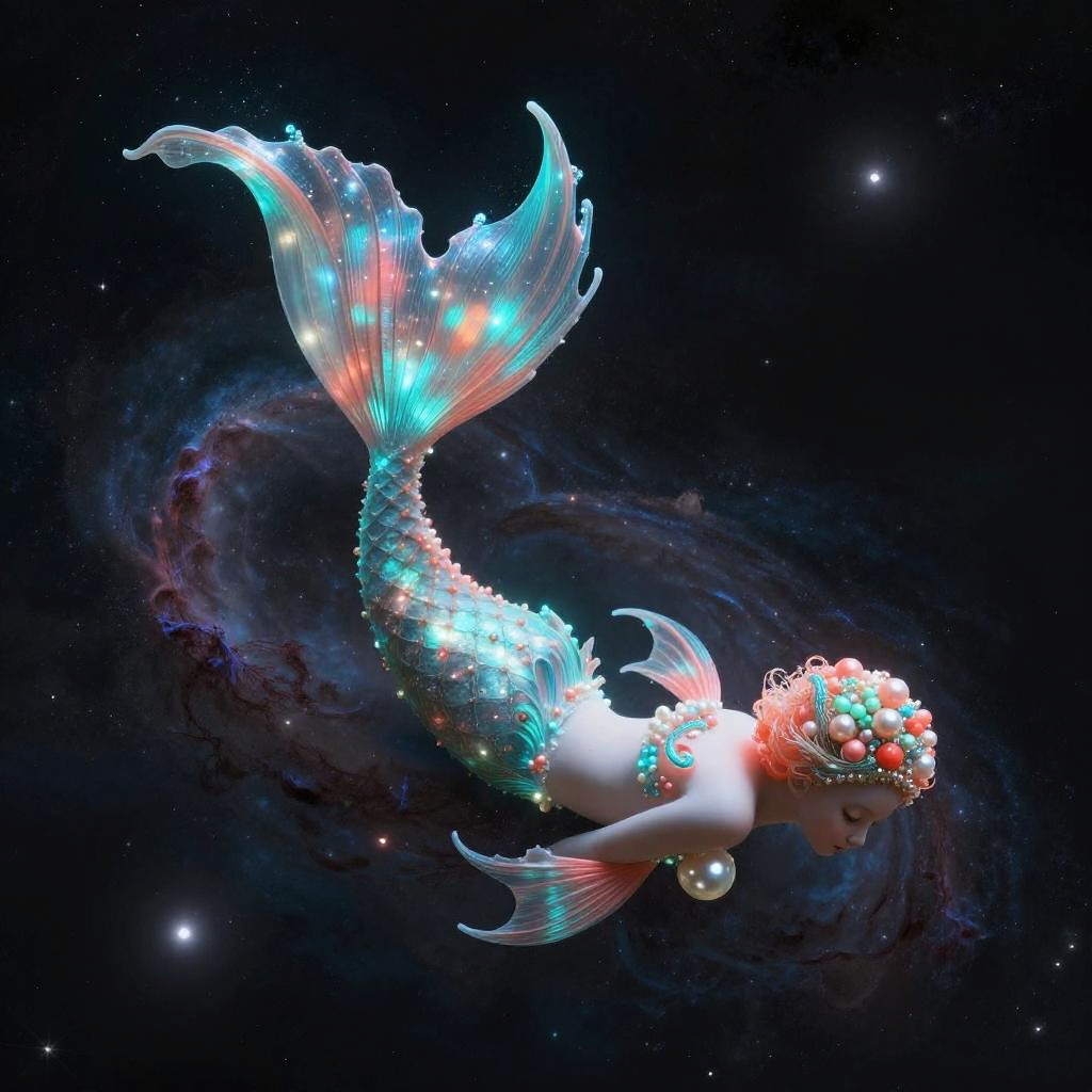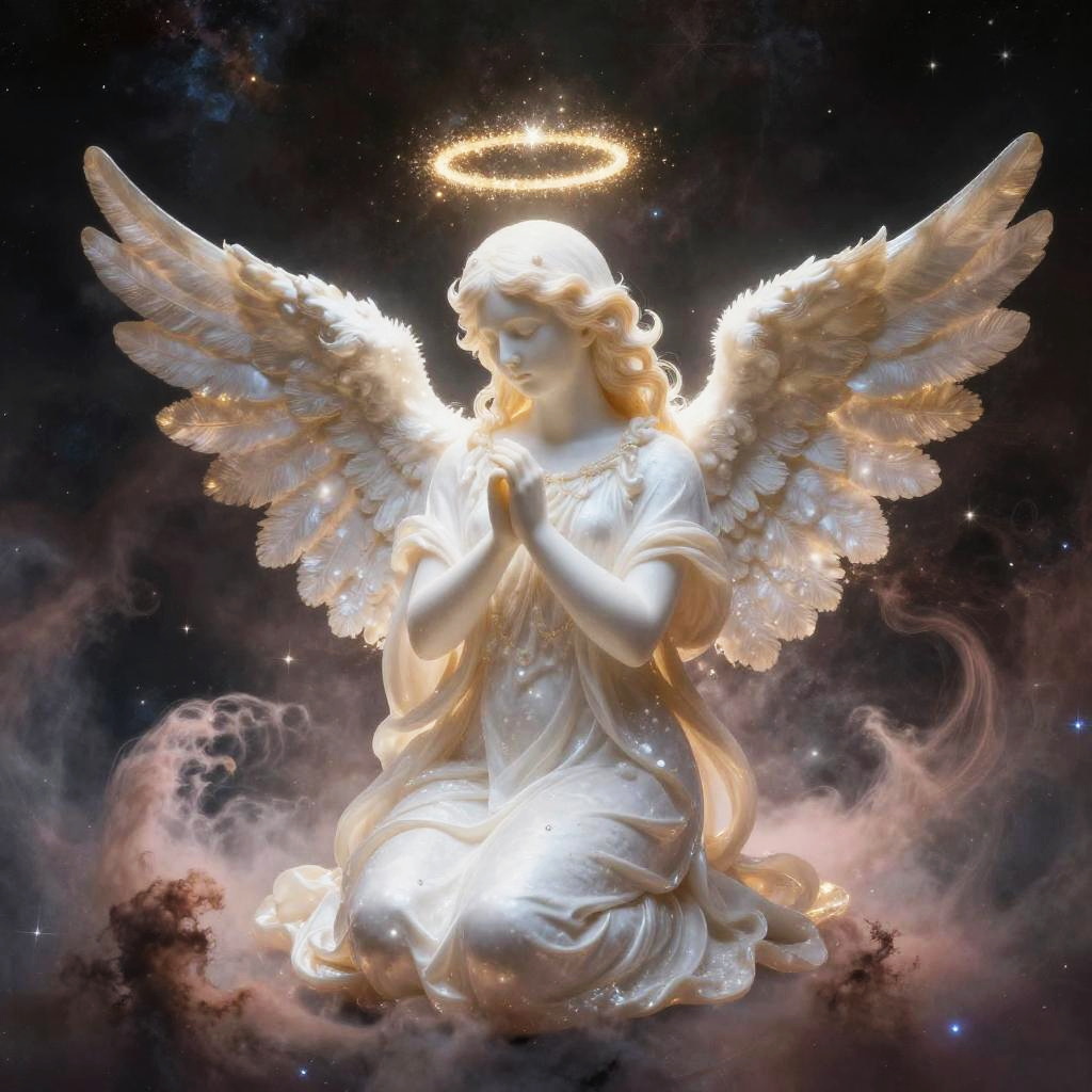 A delicate planetary nebula in deep space, shaped like a fairy seated. The form features twinkling stardust wings with shimmering stardust trailing from the dress. Rendered in soft hues of pastel pink, iridescent lilac, moonstone white, with faint nebula lights creating a glowing silhouette that appears as if in motion. The composition is ultra-detailed, with a mystical and dreamlike quality, capturing an otherworldly sense of elegance.