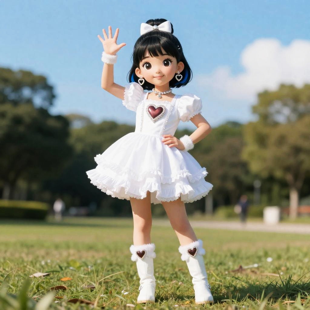 (masterpiece), best quality, (cel anime), highest quality, ((high detail:1.2)), (HDR), (cinematic light:1.1), highres, (5 fingers:1.2), (ultimate cute girl), 1girl, solo, (curewhite:1.5), (little girl:1.5), (full body), half updo, blue sky, park, jewelry, white footwear, earrings, dress, boots, white dress, heart, brooch, magical girl, knee boots, heart brooch, frills, ribbon, bow, black hair, leg warmers, arm warmers, blue hair, heart earrings, black eyes, gloves, hair ornament, smile, (model pose)