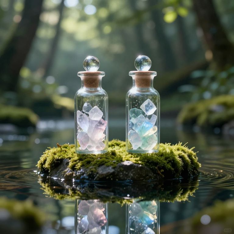 Two ethereal glass vials brimming with luminous, crystalline fragments float serenely atop a mossy stone slab suspended over a tranquil, mirror-like lake, surrounded by a mystical forest bathed in dappled sunlight.
