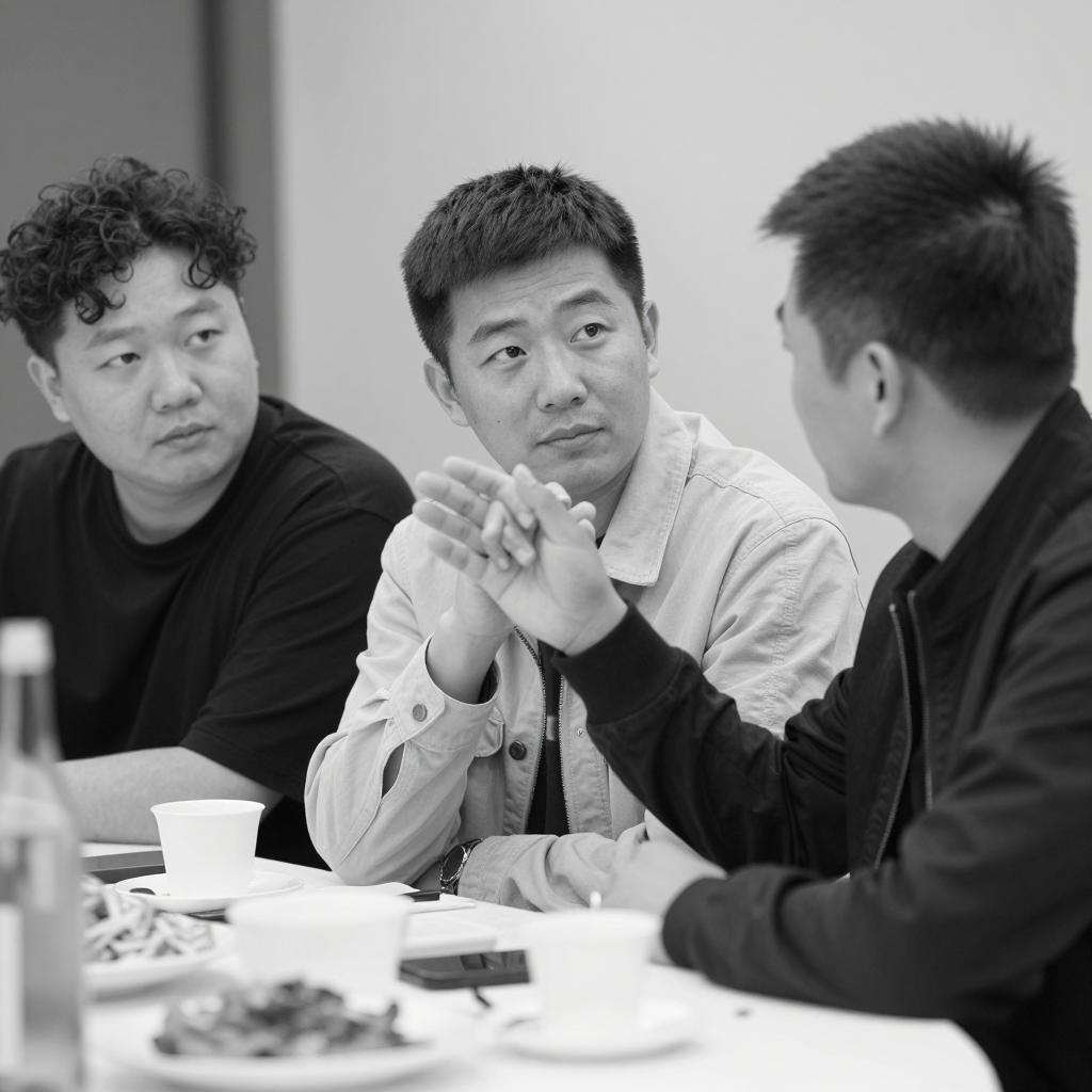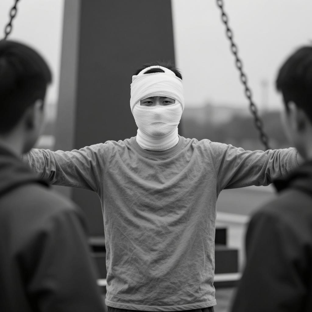Black and white photograph of a person with a bandaged face, wearing a long-sleeved shirt, standing with arms extended. Two people are partially visible on the left and right, facing the bandaged person. Background includes a large, vertical structure with chains. The bandaged person's expression is obscured by the mask.