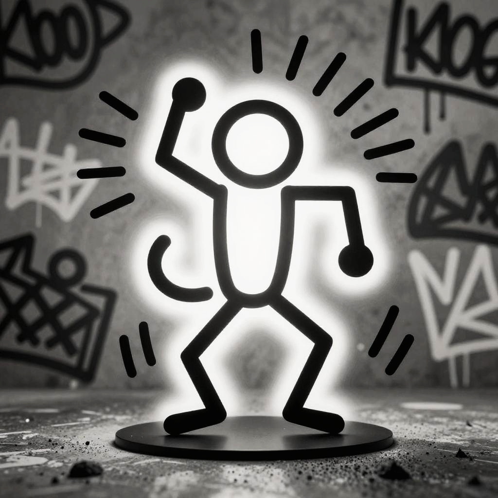 Keith Haring stick figure performing a rhythmic dance, glowing against a monochrome backdrop with bold graffiti splatters, evoking a sense of movement, freedom, and youthful spirit