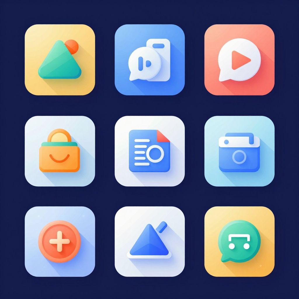 Piktogram style illustration of modern digital icons, clean lines, minimalistic geometric shapes, vibrant color palette, futuristic interface design, high detail, smooth edges