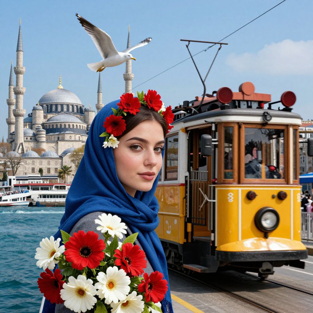Photograph of a young woman with light skin and brown eyes, wearing a blue headscarf adorned with red and white flowers, standing by a yellow tram on a waterfront. She holds a bouquet of red and white flowers. In the background, an iconic mosque with multiple minarets and domes stands against a bright blue sky. A seagull flies overhead. The water in the foreground is blue, and other boats are visible. The image has a vibrant, slightly enhanced color palette, emphasizing the flowers and the tram's yellow.
