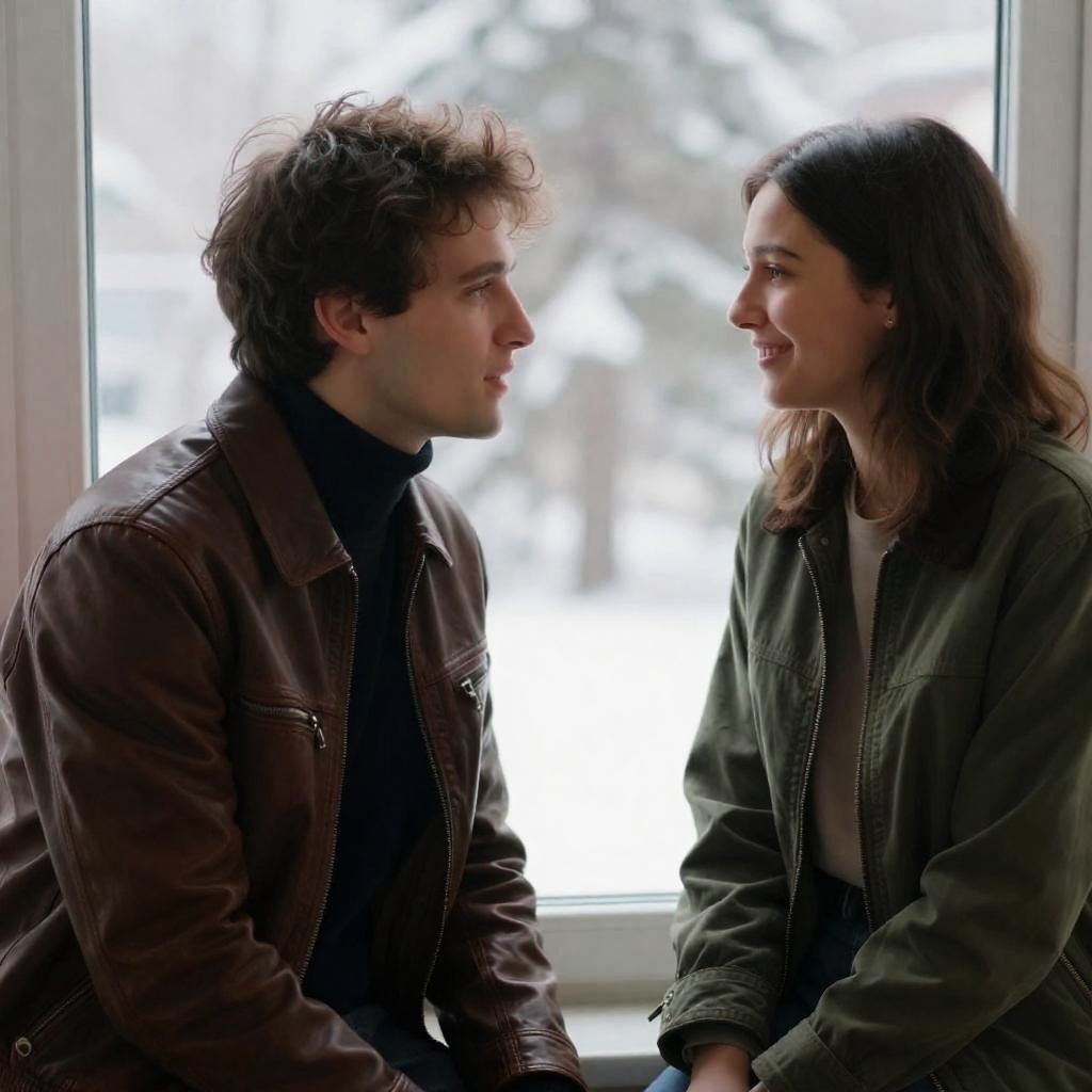 Photograph of two people outdoors. Both have short brown hair, wearing blue denim jackets over dark blue shirts. The person on the left has curly hair, grinning, squinting while raising their hand to shield their eyes. The person on the right has straight hair, serious expression, also raising their hand to shield their eyes. Background includes green trees and a mountainous landscape.