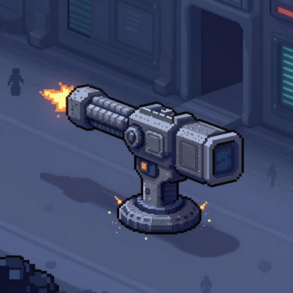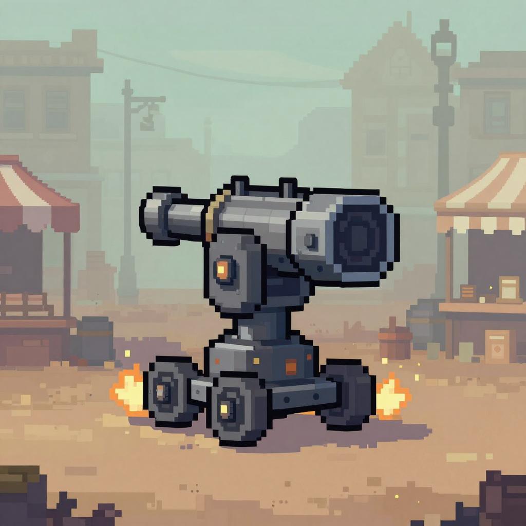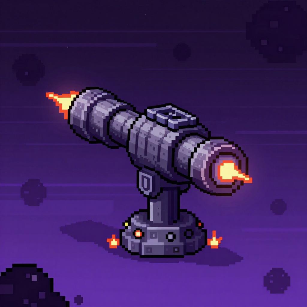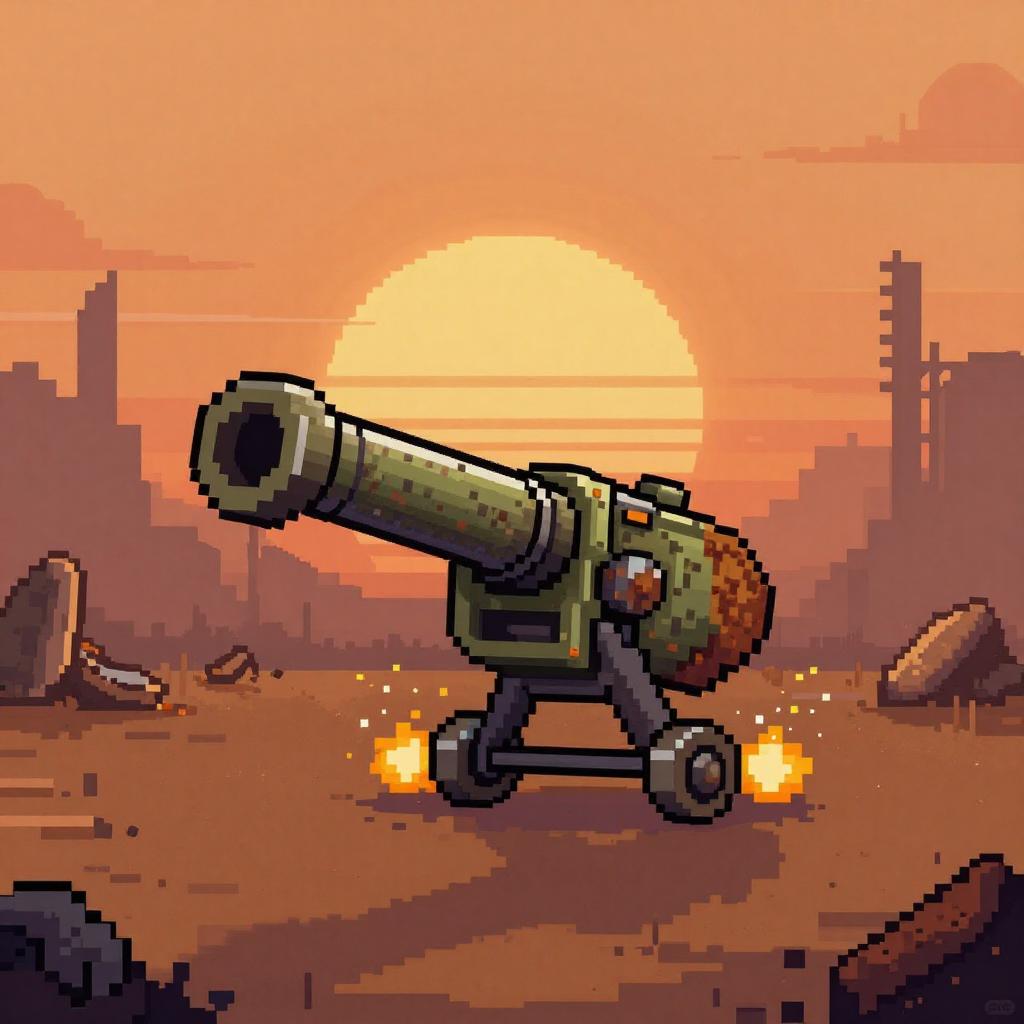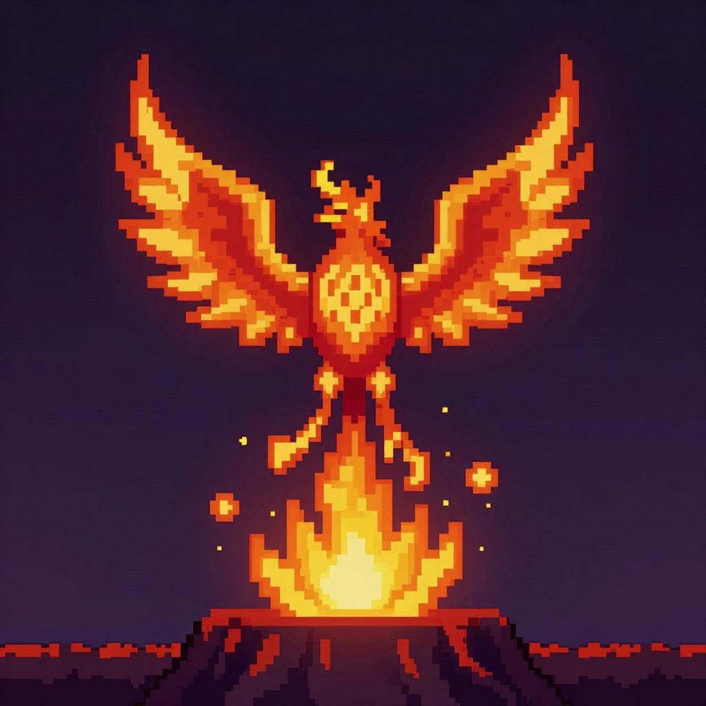 2d mythical phoenix flame turret, retro pixel art, battle-ready, rotating weapon assembly, textured detailing, small explosions and sparks around the base, volcanic crater edge, parallax background elements, ambient effects matching the scene, bold 1px outline, crisp dithering, sprite-sheet friendly, idle-to-fire loop implied, crt bloom and subtle scanlines, dynamic rim light, strong cast shadow, centered composition, clean negative space, clear silhouette at tiny scales, fiery red and glowing amber