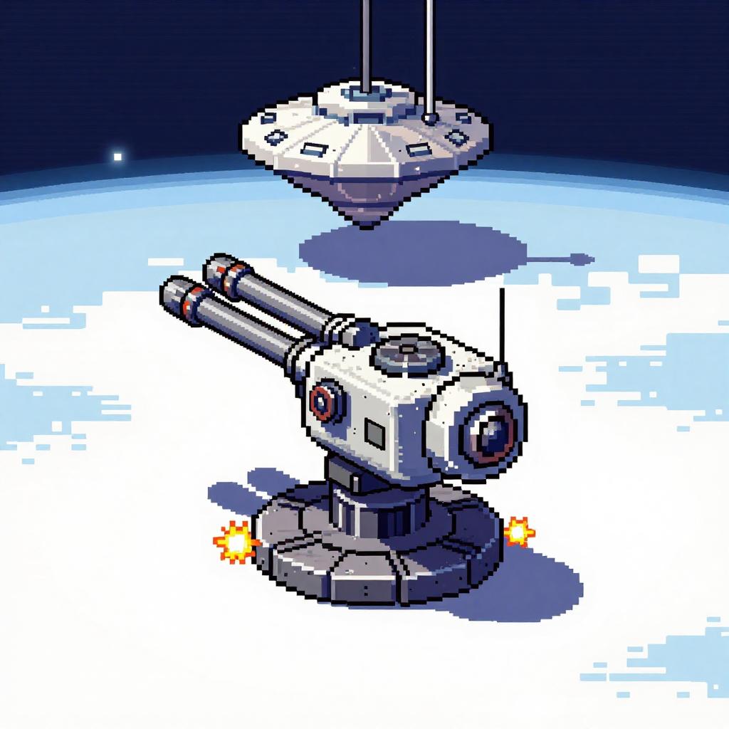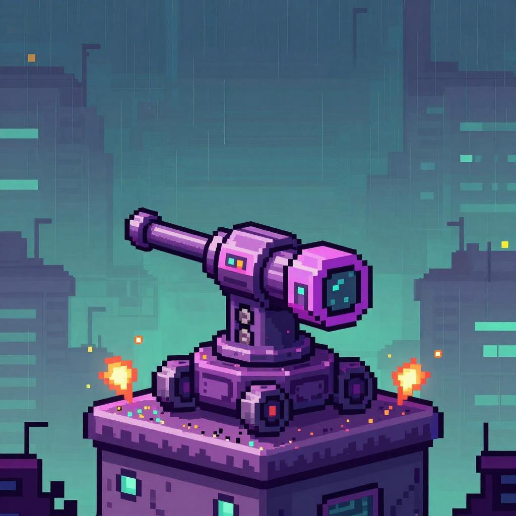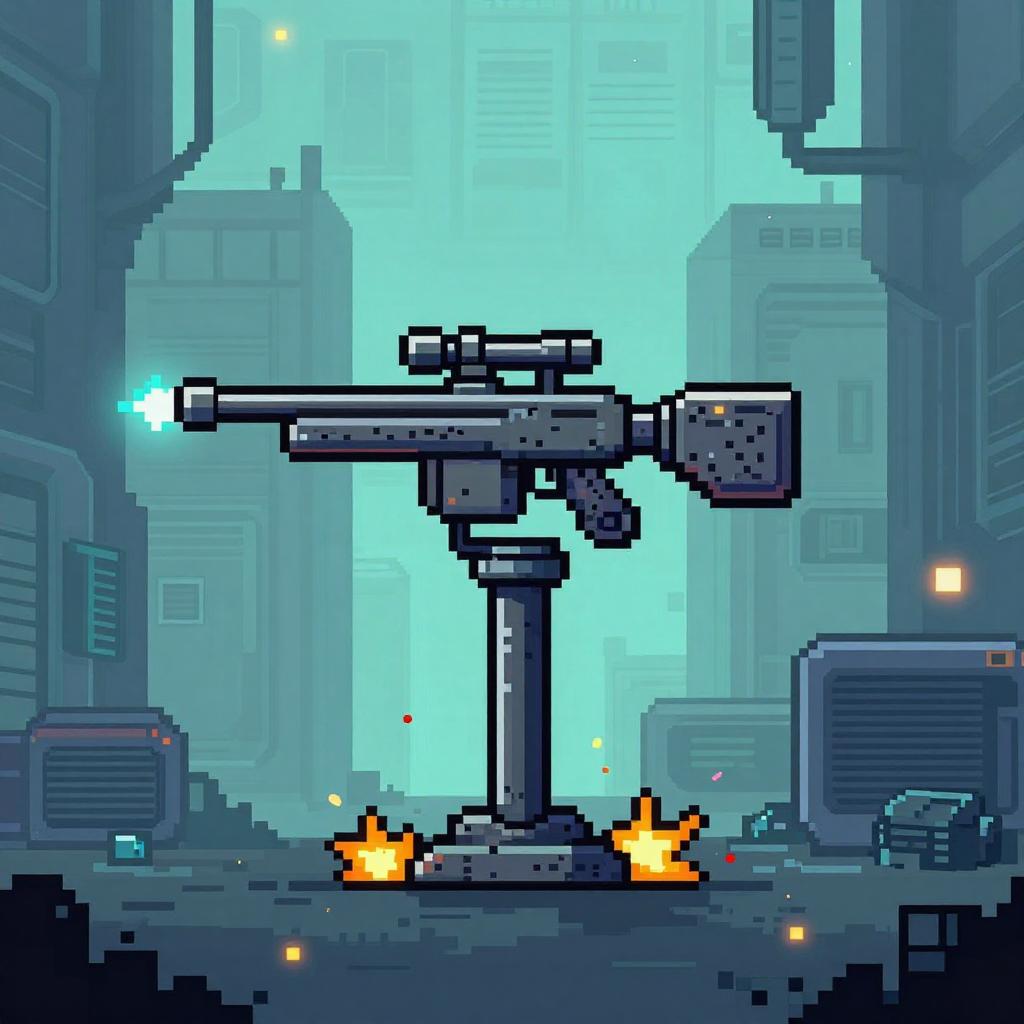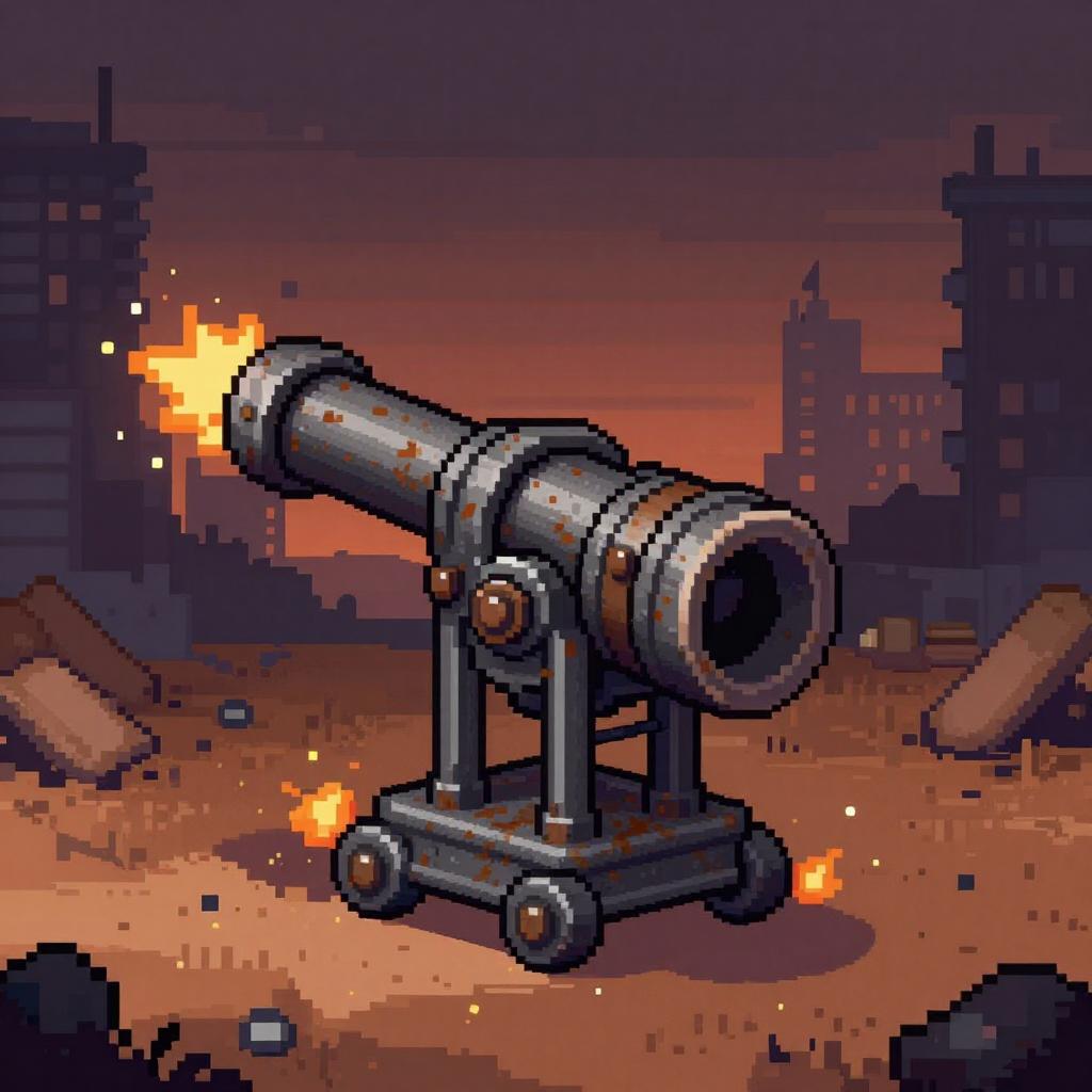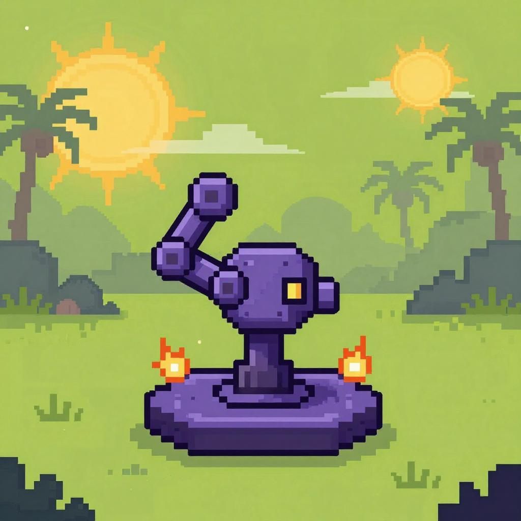 2d mythical phoenix flame turret, retro pixel art, battle-ready, rotating weapon assembly, textured detailing, small explosions and sparks around the base, volcanic crater edge, parallax background elements, ambient effects matching the scene, bold 1px outline, crisp dithering, sprite-sheet friendly, idle-to-fire loop implied, crt bloom and subtle scanlines, dynamic rim light, strong cast shadow, centered composition, clean negative space, clear silhouette at tiny scales, fiery red and glowing amber