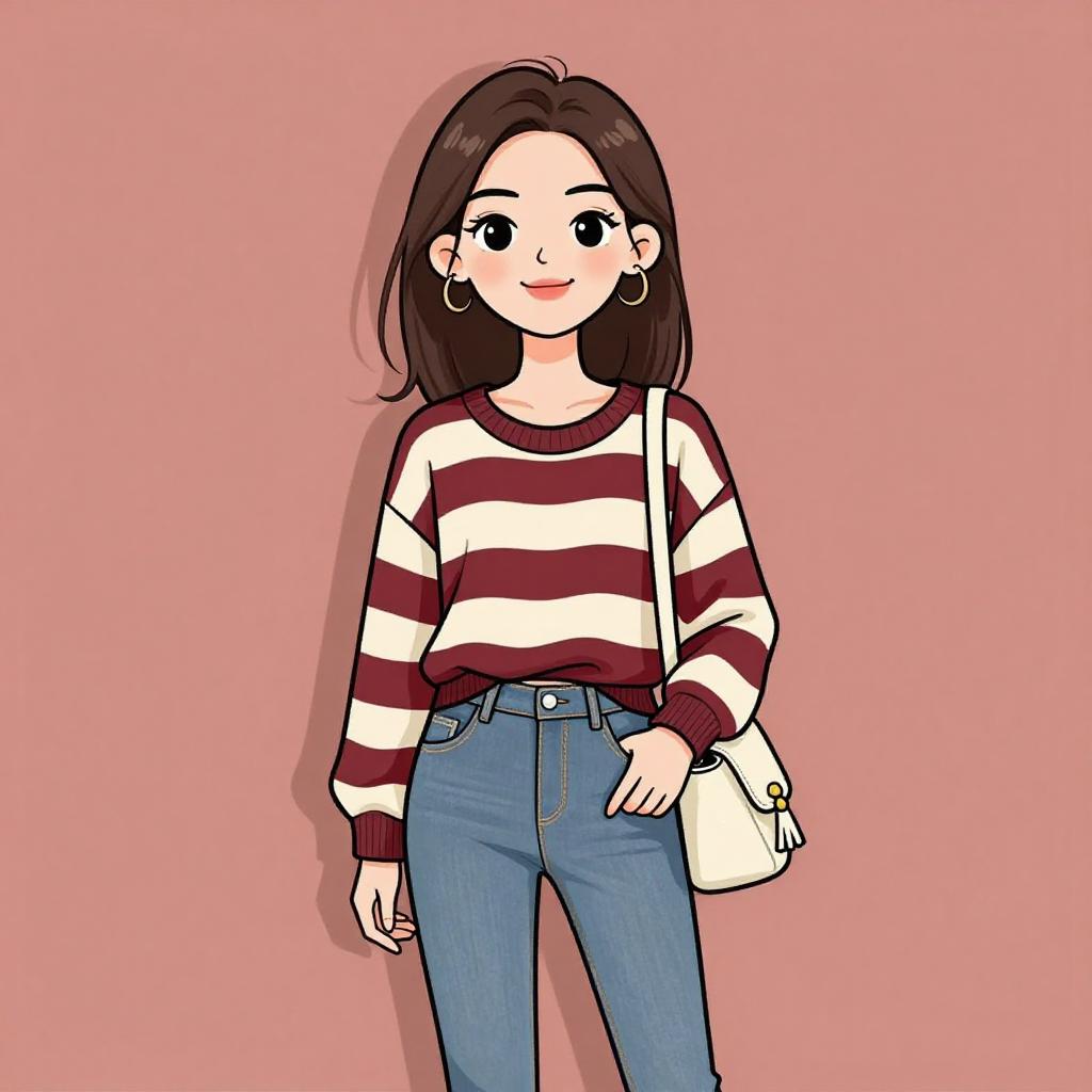 Woman with pretty face and pretty hair. smiling Woman, casual, horizontal striped black and white t-shirt with red accents, v-neckline with red button details, short cuffed sleeves with red trim, partially tucked into denim jeans, black shoulder bag with a rounded shape and zip closure. --sref 1467
