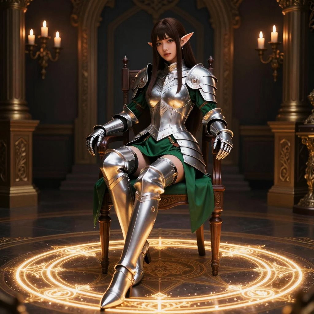 A digital artwork of a fantasy elf woman sitting on a wooden chair in a dark, ornate room. She's wearing shiny silver armor with intricate patterns, a green skirt, and matching thigh-high boots. Her pointed ears and straight brown hair with bangs are prominent. She's illuminated by a glowing magical circle on the floor, with candle-lit sconces in the background.